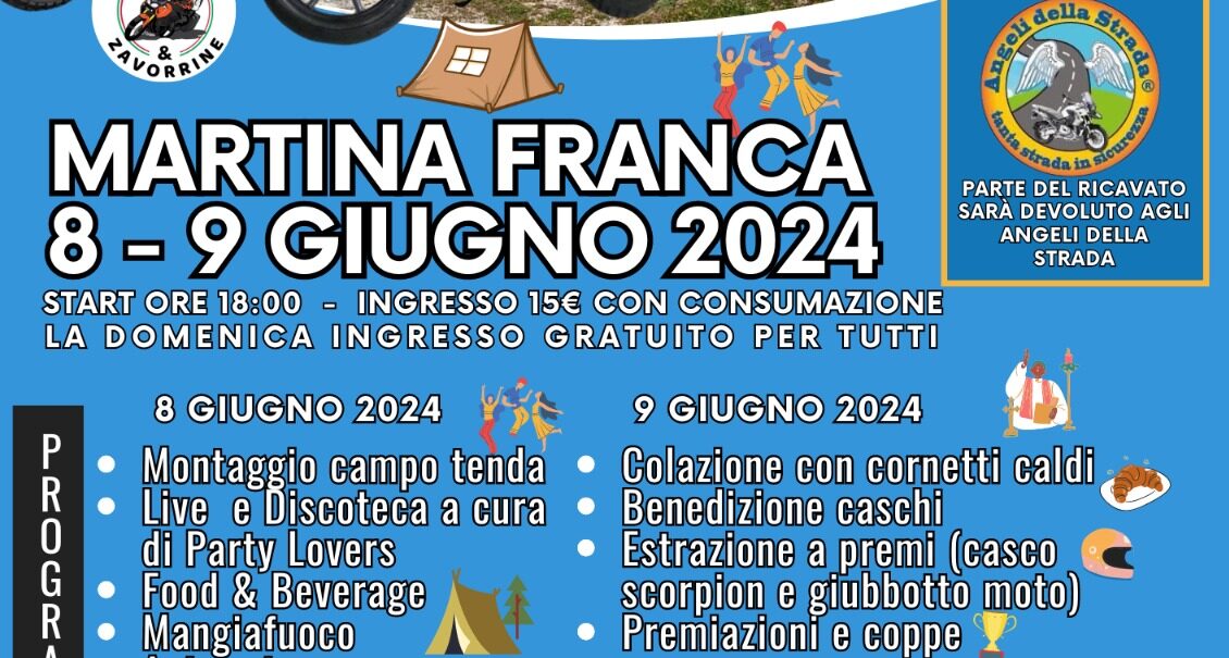 La Valle d’Itria si prepara ad accogliere un evento motociclistico indimenticabile organizzato dai Power Bikers Puglia con Enzo De Rosa, Gianni Vinci sotto il coordinamento di Franco Aquaro. L’evento si terrà nei giorni 8 e 9 giugno 2024, a partire dalle ore 18:00 del sabato, promettendo due giornate all’insegna del divertimento, della musica e della solidarietà.