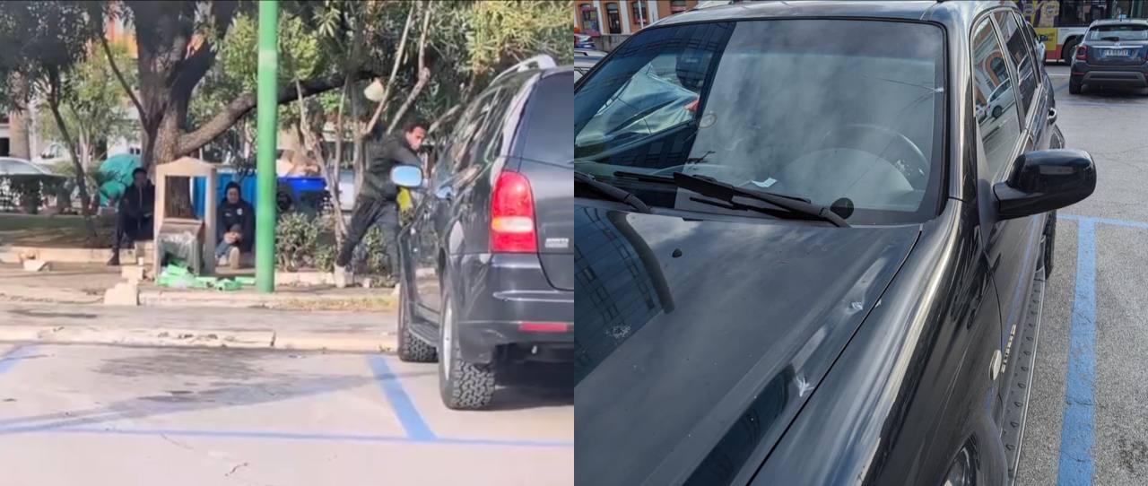 Bari, follia in piazza Moro: raccoglie un masso e lo scaraventa contro un’auto parcheggiata – VIDEO