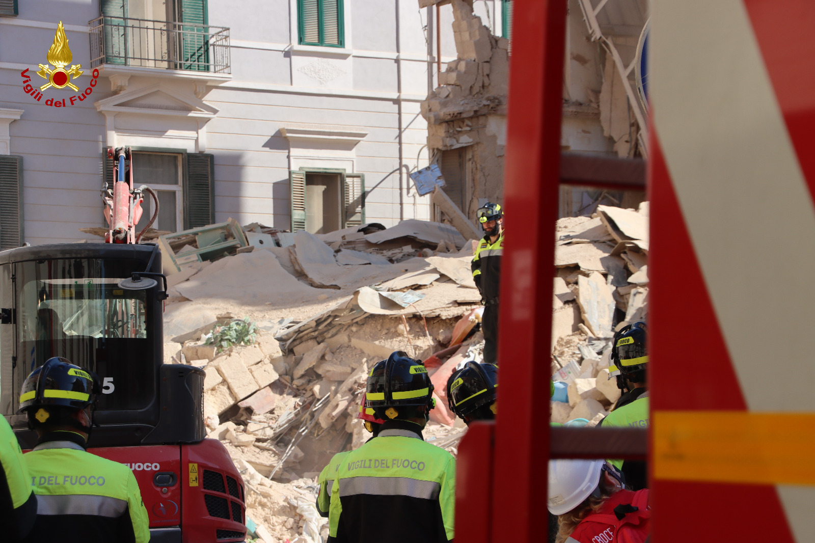 Sono 19 le squadre dei Vigili del Fuoco a lavoro tra le macerie del crollo di via De Amicis, in campo anche il personale della Direzione VVF Puglia specializzato nel volo di droni. In supporto anche squadre da Foggia, Avellino, Caserta, Salerno, Napoli e una squadra di cinofili di Lecce. Le ricerche si concentrano nella zona al di sotto dell’appartamento della 74enne Rosalia De Giosa, l’unica signora dispersa, e dove fino alle prime luci dell’alba si riusciva a percepire il suono del telefonino. Si alternano i lavori delle ruspe che aprono le macerie con quello di uno speciale gruppo addestrato per la ricerca di persone sotto le macerie.