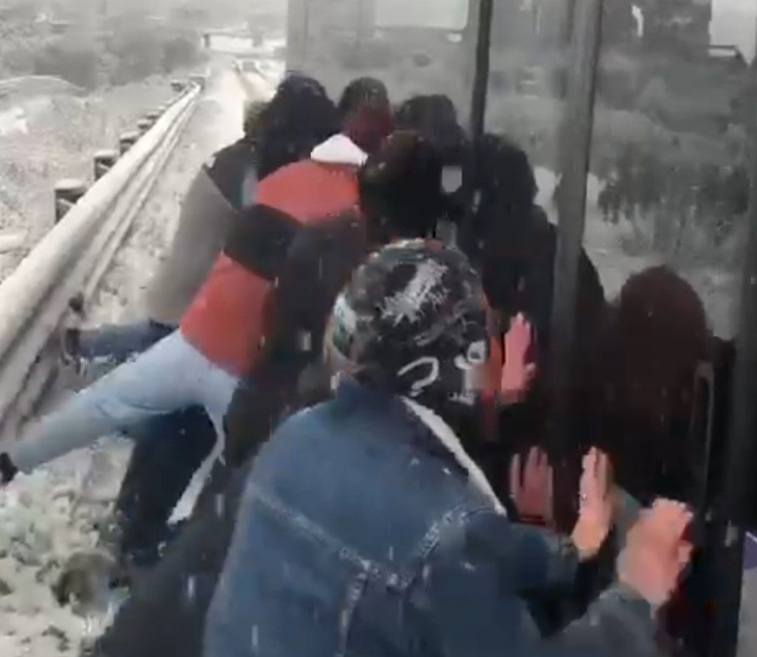 Una mattinata insolita per gli studenti a bordo che, nonostante il maltempo e il grande gelo, sono scesi per strada e hanno spinto il mezzo.