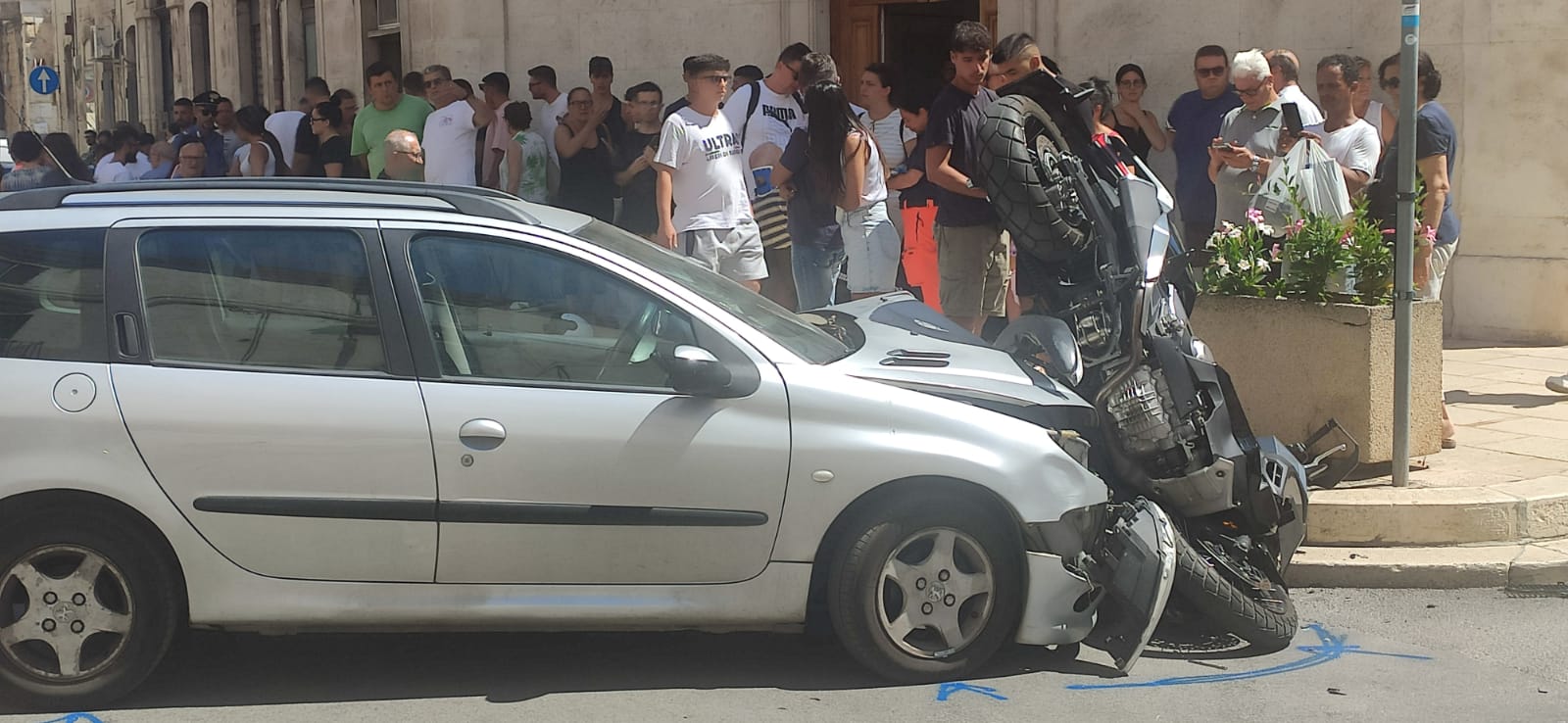 Incidente questa mattina a Terlizzi all’incrocio tra via Diaz e via Bernardi e a due passi dalla parrocchia del Santissimo Crocifisso. Fortunatamente nessuno ha riportato ferite gravi, i due in sella alla moto sono stati scaraventati sull’asfalto.