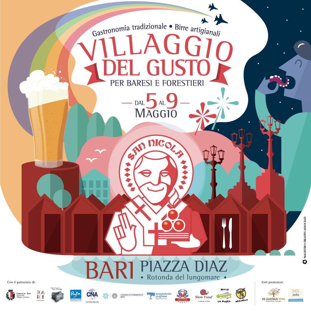 Il Villaggio del Gusto, è patrocinato dal Comune di Bari e promosso dall’associazione De Gustibus Vitae di Bari, in collaborazione con Cna Area metropolitana di Bari e Bat. La manifestazione ha inoltre il patrocinio di Camera di Commercio di Bari, Puglia Promozione, Acquedotto Puglise, Slow Food – Condotta di Bari, Federazione Italiana Cuochi – Sezione Associazione Cuochi Baresi, Aci Bari Bat, associazione All In Festival, associazione PlasticFree, LeZZanzare, Unionbirrai.