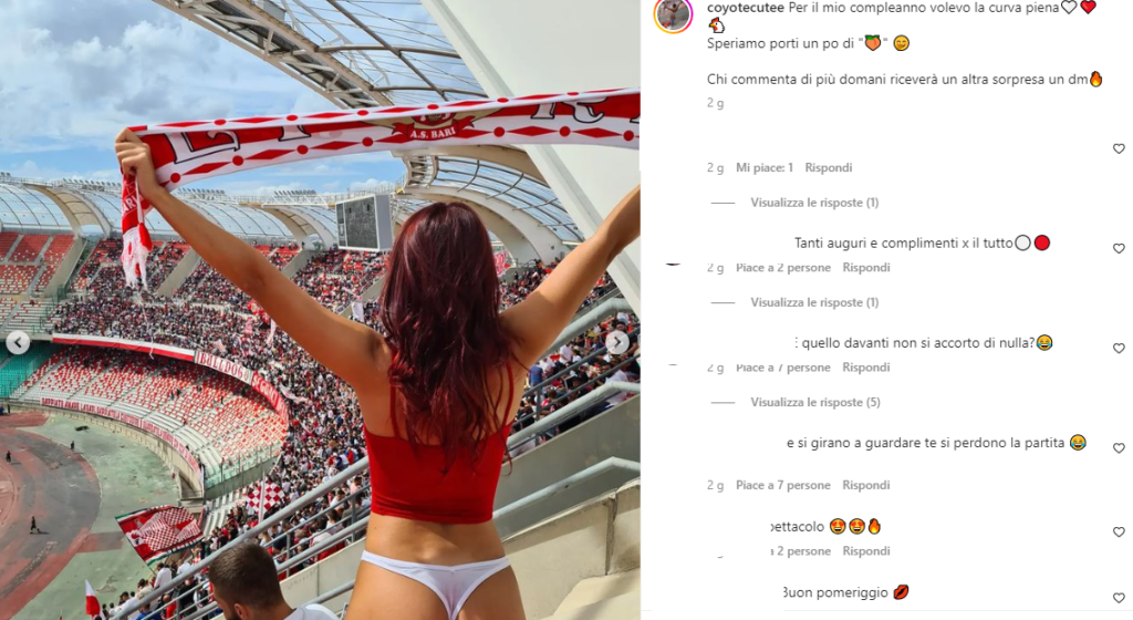 Si era spogliata già il 3 settembre sugli spalti del San Nicola in occasione della vittoria del Bari contro la Spal e lo ha rifatto sabato 1 ottobre dopo la vittoria dei galletti sul Brescia. per questo la Questura di Bari sta raccogliendo informazioni per approfondire la posizione della 21enne barese attiva su Instagram con il nome Coyotecute Pugliese e che in merito alla partita contro la Spal aveva detto di essere una donna libera e che su OnlyFans guadagna anche 5mila dollari al mese. Le Forze dell’Ordine si sono attivate per identificare la ragazza e capire se i suoi atteggiamenti possono sfociare in una denuncia per atti osceni in luogo pubblico o atti contrari alla pubblica decenza. La giovane, in una intervista a BariViva aveva spiegato di lavorare come creatrice di contenuti per adulti. Di lei si sa che è diplomata al liceo Scacchi di Bari e che studia Comunicazione digitale all’università di Urbino. In caso di infrazione, la 21enne rischia una sanzione amministrativa di diverse migliaia di euro.