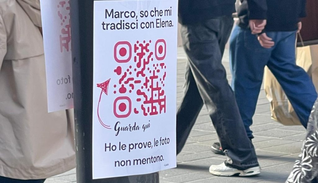 “Marco, so che mi tradisci con Elena. Ho le prove, le foto non mentono”. Questo il messaggio che si può leggere su alcuni volantini che hanno tappezzato la città di Bari, come in via Sparano. Dentro un QR Code con la scritta “Guarda qui” che rimanda ad una galleria di fotografie. L’autrice ha voluto “sputtanare” il suo fidanzato in una maniera davvero originale, non c’è altro da dire. Non è da escludere però che dietro possa esserci altro, come una trovata pubblicitaria.